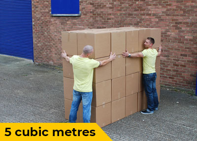 5 cubic meters would be about the norm for a couple that are moving overseas (without furniture). Charlie and Drake below are demonstrating what 5 cubic meters looks like. To give you an idea on the costs for a 5 cubic meters international move from London to Paris would be around £700, and from London to Madrid would be a little more than £1,000.